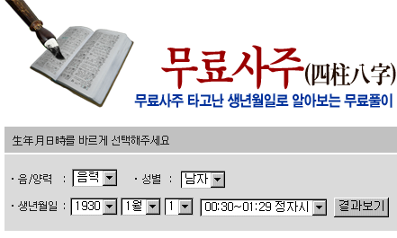 ¹«·á»çÁÖ¿¡¼­µµ ¸¶Âù°¡Áö·Î »ç¶÷ÀÇ ±æÈäÈ­º¹À» ³â(Ò´), ¿ù(êÅ), ÀÏ(ìí), ½Ã(ãÁ)¸¦ ¹ÙÅÁÀ¸·Î ÇÏ¿© ¹Ì·¡¿¡ ´ëÇØ ÀÚ¼¼ÇÏ°Ô ¾Ë·ÁÁÖ´Â Çй®À̱⠶§¹®¿¡ »çÁÖ¿¡¼­ °¡Àå ±âº»ÀûÀ¸·Î ±¸¼ºÇϰíÀÖ´Â ³â(Ò´), ¿ù(êÅ), ÀÏ(ìí), ½Ã(ãÁ)¾ß ¸»·Î »çÁÖ¸¦ ±¸¼ºÇÏ°í ¶Ç »çÁÖ¸¦ º¸±â À§ÇÑ °¡Àå ±âº»ÀûÀÎ ±¸¼º¿ä¼ÒÀÎ °ÍÀÔ´Ï´Ù.